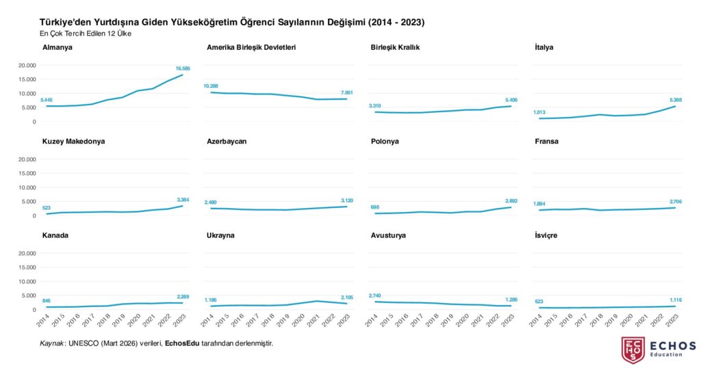 2023 yılı itibarıyla Almanya’nın (16 bin 600 öğrenci) artık ABD’nin (8 bin) ve İngiltere’nin (5 bin 400) toplamından bile daha fazla sayıda Türkiye’den giden yükseköğretim öğrencisine ev sahipliği yaptığı görülmektedir. Almanya’nın 2014 yılında 5.445 olan öğrenci sayısını on yıl içinde yaklaşık 3 katına çıkarması, sunduğu düşük maliyetli eğitim ve yaşam maliyeti ile mezuniyet sonrası sunduğu fırsatlarla ilişkili görünmektedir. ABD her ne kadar son on yıl içerisinde öğrenci sayısını azaltsa da Türkiye’den giden öğrenciler için hâlen ikinci ülke konumundadır.
